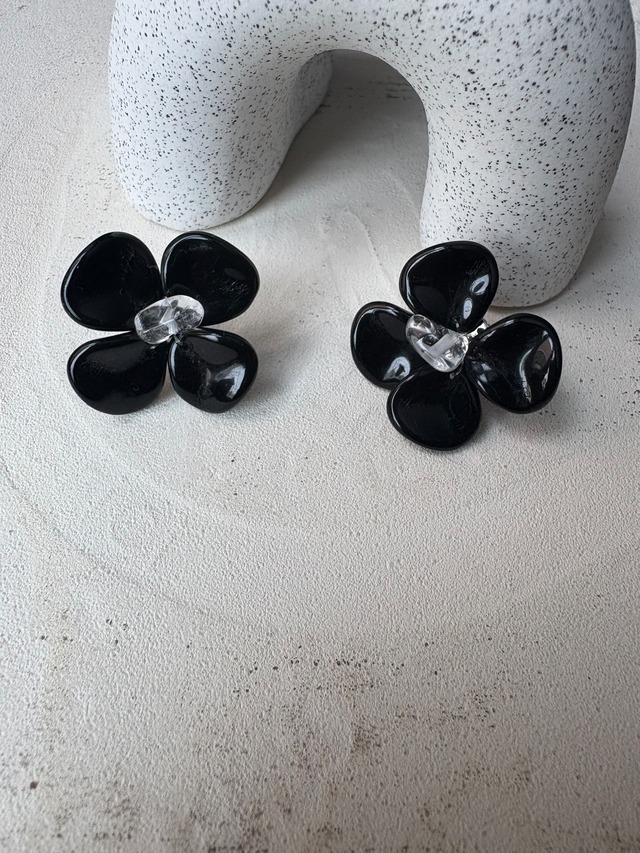過去に大変好評だったおはなちゃんを 今回ピアスとイヤリング各1点ずつのみ 販売いたします。 こちらはチタンポストのピアスです。 ブラックの花びらに、中心に小さな天然石を 集め入れました。 大きさの雰囲気は3枚目の写真で ご確認ください。 素材:ビーズ・天然石