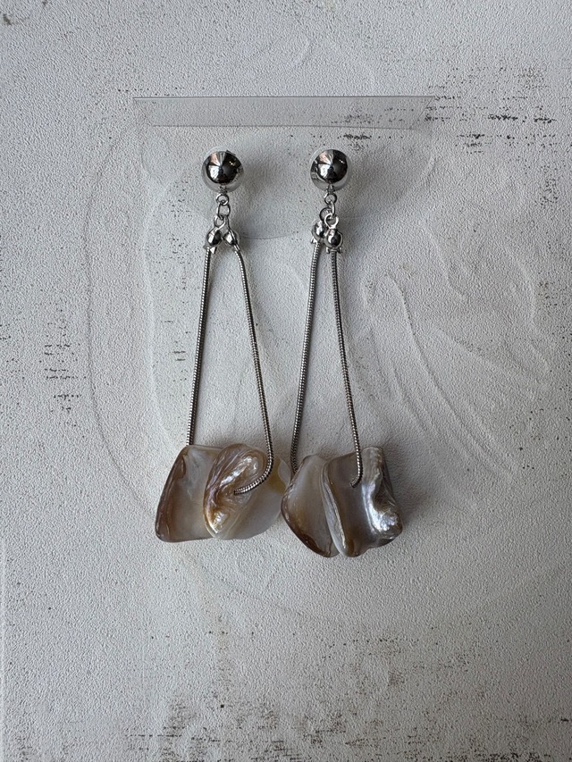個性のある形のシェルと スネークチェーンを使用した耳飾り。 透け感のある夏向けの装いなら涼しげに 厚手のニットなら顔周りを軽くしてくれて 手放せないおひとつになると思います。 シンプルにこちらを着用するのはもちろん、 イヤーカフなどと重ね付けもオススメ! ※長さの違いがあるので、ご購入の際は お間違えのないようお願いいたします。 個体によってチェーンの長さが多少変わります。だいたいの長さでご理解くださいますようお願いいたします。 ピアスはチタンポスト、イヤリングは真鍮で お作りいたします。 素材: 真鍮・シェル