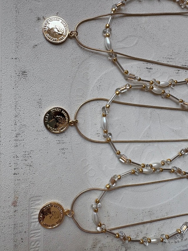 コインとチェーン、形の異なるビーズを 合わせて煌びやかな女性らしいデザインに お作りしました。 1本で華やかになるネックレスで気分も 上がります。 長さ:約43cm➕アジャスターで4.5センチほど長くすることができます。 素材: 真鍮・ビーズ